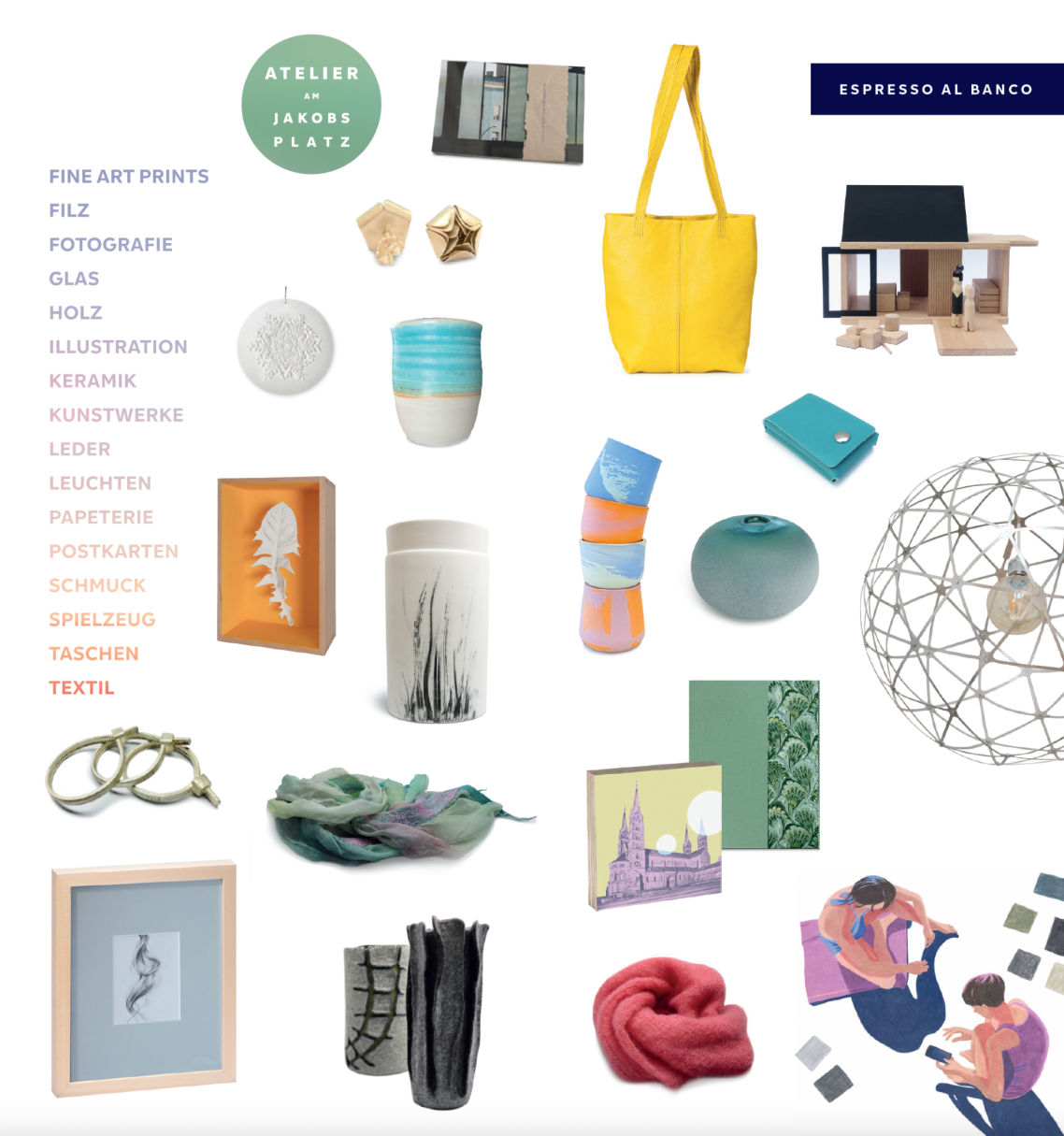 Hier finden Sie Kunst, Design und Handwerk aus der Region. Zusammen mit 15 weiteren Kreativen freue ich mich ein spannendes, vielfältiges und inspirierendes Sortiment anzubieten: Fine Art Prints, Filz, Fotografie, Glas, Holz, Illustration, Keramik, Kunstwerke, Leder, Leuchten, Papeterie, Postkarten, Schmuck, Spielzeug, Taschen, Textil.
